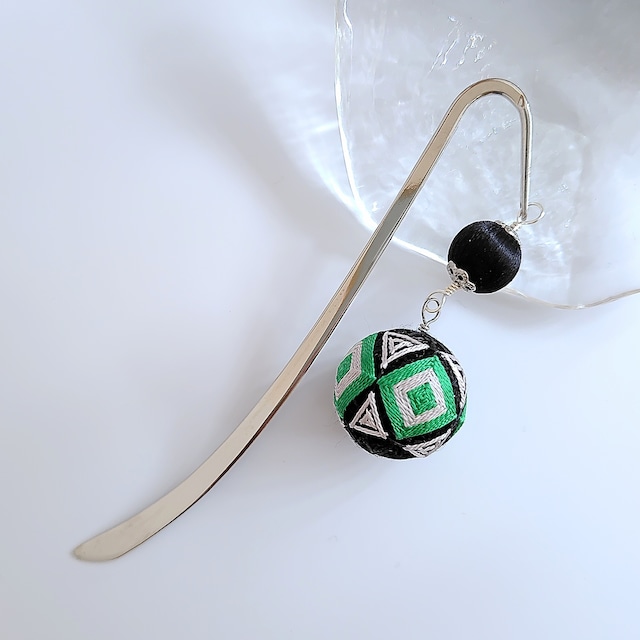 黒色の細糸を巻いた上に、 グリーンとシルバーの絹糸を交互にかがった 手まりのブックマーカーです。 和の"手まり"を普段使いできるチャームとして 栞に仕立てました。 Viereckはドイツ語で"四角"の意味。 四角を重ねた幾何学模様の手まりです。 緑と銀を組み合わせたシャープなブックマーカで、 男女問わずお使いいただける模様となっております。 落ち着いたブラックカラーの巻き玉も 上品な光沢を伴って、 本やノートの間から揺れる鮮やかな手まりが 趣味の時間をより特別なものにしてくれます。 御朱印帳やノートなど、 お気に入りの冊子に挿んでも素敵です。 自分時間を楽しむお供になります。 直径2cm。 絹糸と綿で制作しているため、 本体の重さはほとんど感じません。 ○商品情報 素材:オーガニックコットン、絹糸、銀糸 金具:真ちゅう サイズ:てまりの直径 2cm ブックマーカーの長さ 約10cm ブックマーカー部分を含む飾り側の長さ 約5.3cm ○ご注意いただきたいこと 素材は主に綿と絹糸のため、強い力には弱いです。 変形、破損する恐れがありますので、どうぞ優しくお取り扱いくださいませ。 また、絹糸は水に弱いため、雨や汗に濡れた環境や摩擦などは色移りの原因となります。 もしぬれてしまった場合には、布物から離して自然乾燥させていただきますよう、お願いいたします。